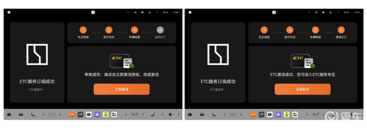 第三步:完成激活资料审核通过后,点击「立即激活」按钮,车机端出现「ETC激活成功」展示,即完成设备激活,可点击立即前往进行ETC相关功能使用。