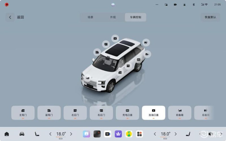 (2)中控屏选择「3D车模界面」-「个性化」-「车辆控制」,点击加油口盖,即可解锁