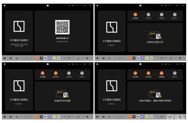 第二步:提交审核完成订阅后,使用极氪App扫码,填写ETC办理人信息、行驶证信息,通行费代扣签约(支持微信、支付宝、银行卡扣款),完成后提交资料进行审核。审核过程中,车机将清晰展示当前审核节点状态。