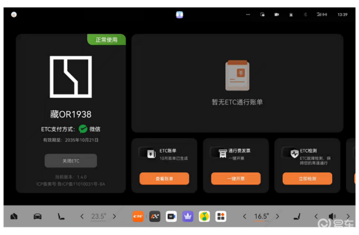 (1)设备检测——可查看ETC设备状态、排查“无法通行”、“状态异常”等问题进入车机「ETC服务」APP,点击「ETC检测」。系统将自动展示设备信息,包括ETC卡信息(关联车牌、车牌颜色、卡类型等)、OBU信息(设备编号、品牌、状态、车辆类型等)。