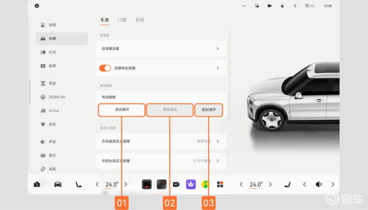 电动踏板可在中控屏选择「车辆」-「车身」,进行模式设置: