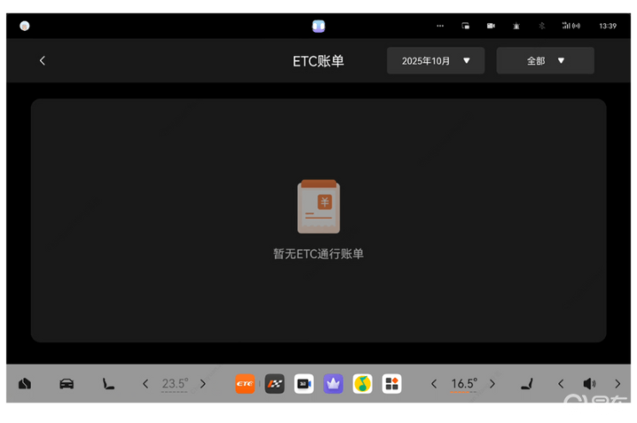 (2)查看账单—可查看ETC通行账单内容进入车机「ETC服务」APP,点击「ETC账单」。系统将展示高速通行账单,包括通行时间、金额、出入口等信息。支持按时间筛选。